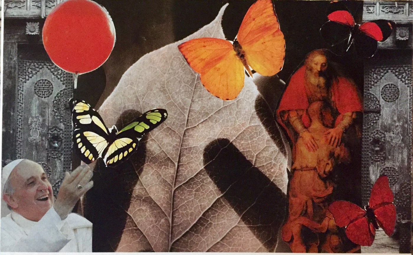 For Christmas, I wanted to create a SoulCollage® card for my monk friends at Christ the King Priory that represented the season. I gathered images that seemed Christmas-y and tried to bring them into unity on a card. But it just wasn’t working; images that called to me instead kept saying MERCY. So I went with it. I let the word and idea of mercy flow over me and into the creation. The process of creating was prayerful and inspired and joyful. The card and words that follow are the result: